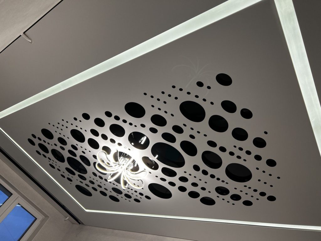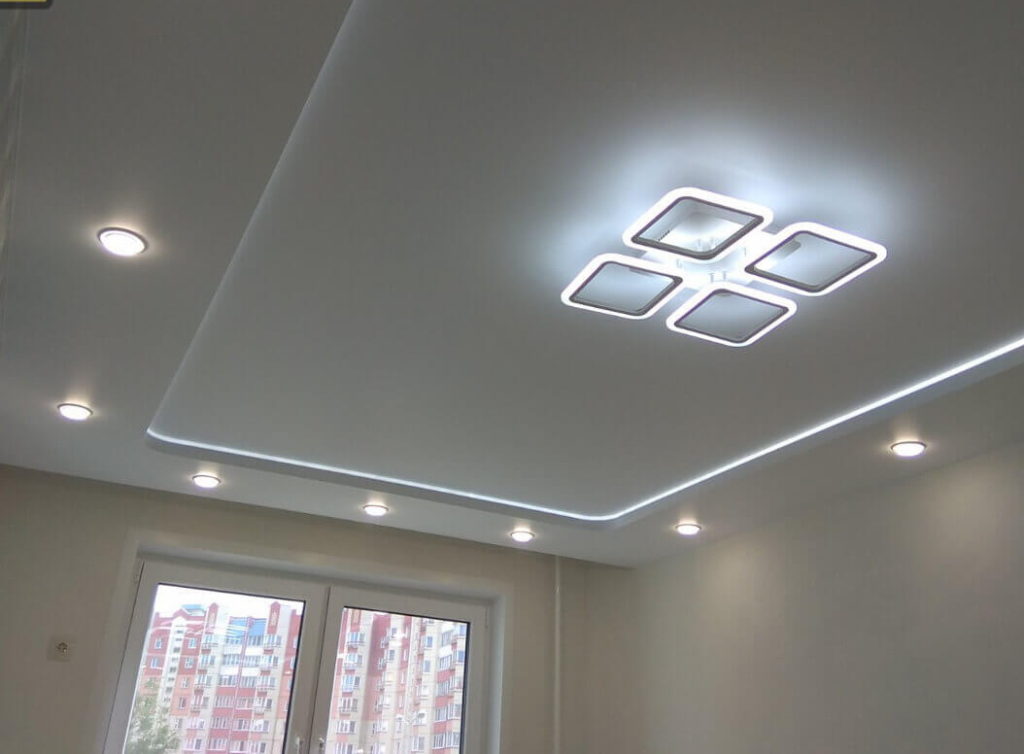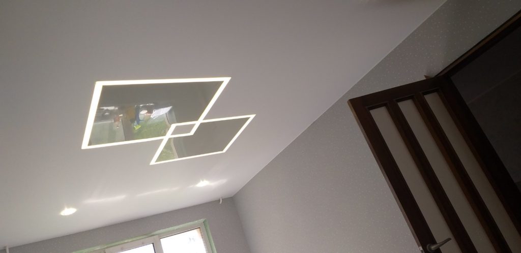 - Опыт мастеров и профессиональное оборудование позволяют работать с заказами любой сложности. Хотите создать потолок в несколько уровней с подсветкой и фотопечатью? Для нас – это не задача!